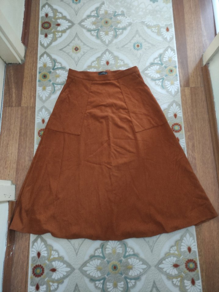 Kahverengi uzun süet etek, bol kesim ve drapeli tasarımıyla bohem stilini yansıtır, günlük kullanım için uygundur.
