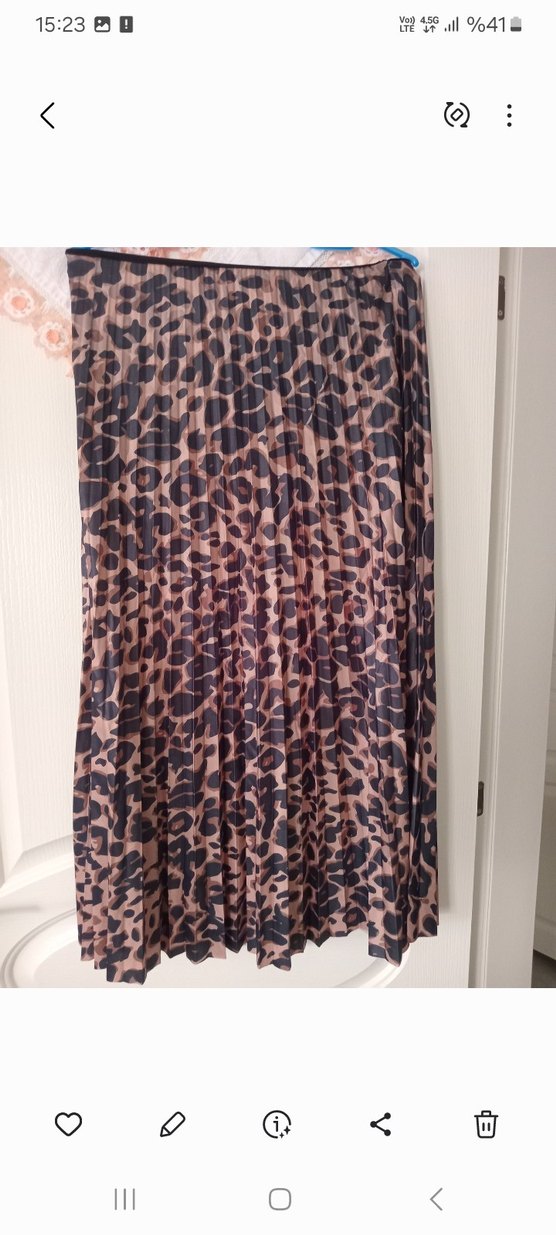 Sentetik kumaştan, kahverengi yılan desenli, pilili ve bol kesim uzun etek. Bohem ve retro sokak tarzına uygun.
