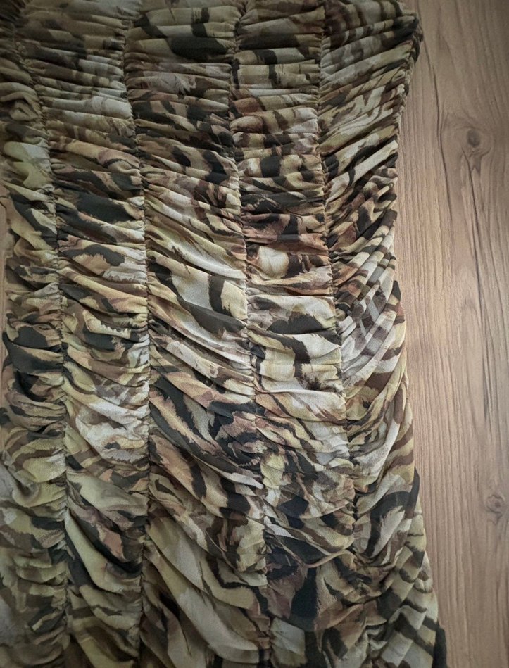 Bej ve gri kamuflaj desenli, bohem tarzda, büzgülü dokulu bir perde. Her odaya farklı bir hava katar. Straplezdir iç kısımdaki tutucu lastikler sağlamdır. Hiç giyilmedi.