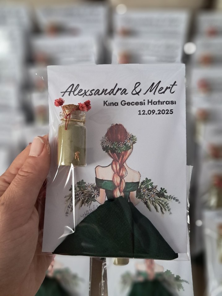 Koyu haki renkte, bohem tarzda, 12.09.2025 tarihli Alexsandra & Mert Kına Gecesi hatırası.