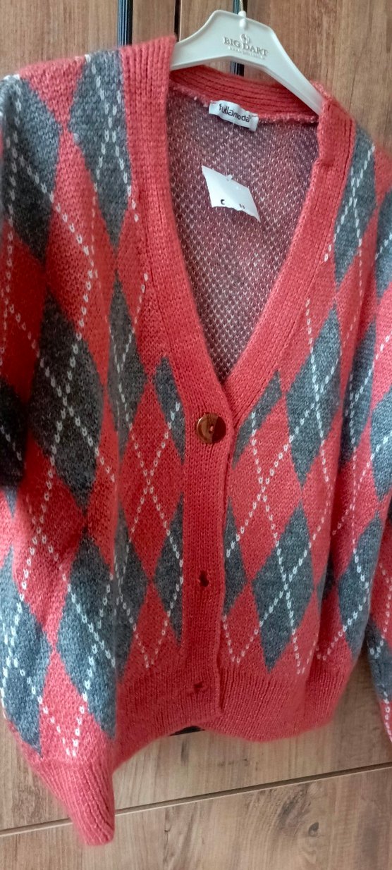Bohem tarzda, uzun kollu, V yakalı, kırmızı ve gri baklava desenli örgü hırka. Rahat kesim ve midi boy, günlük kullanım için uygundur.