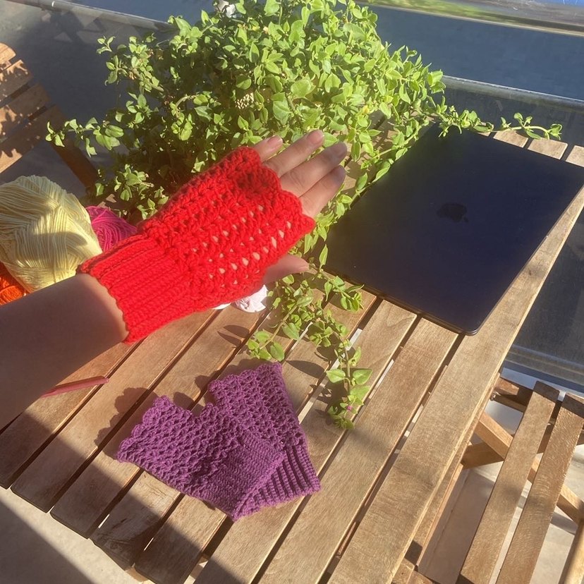 Bohem tarzda, kırmızı örgü parmaksız eldivenler, renkli ve rahat bir görünüm sunar. İstenilen renk modelde çalışılır