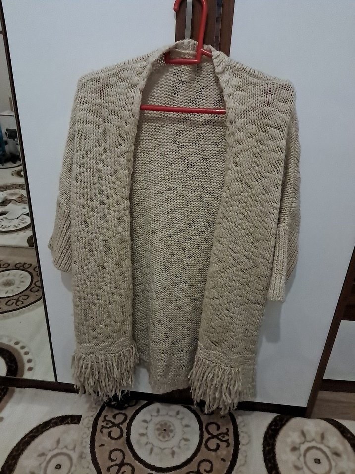 Bej renkli, kısa kol ve bol kesim, bohem tarz örgü kadın hırka. Düz renk, ve püsküllü detaylı, günlük kullanıma uygun. az aşağıda leke var ve tüylenme mevcut