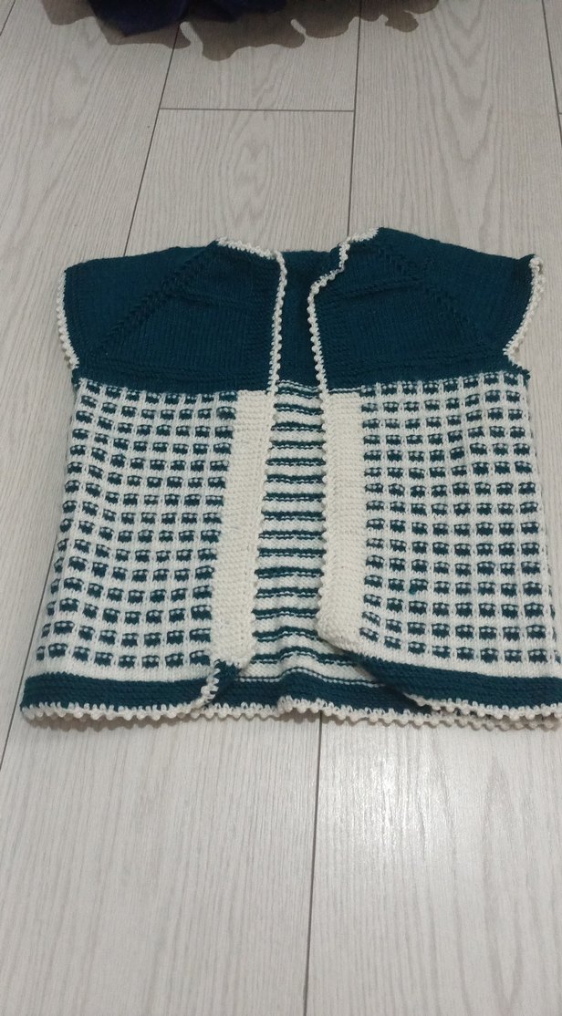 Kısa boy, kolsuz hamile süveter; örgü dokusu, bisiklet yaka ve bohem tarzda. Beyaz ve gri kareli deseniyle günlük kullanıma uygun. +