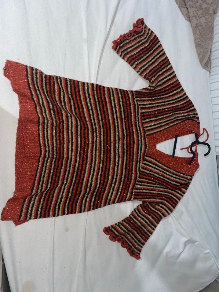 Fitted kesim, kısa uzunlukta örgü kadın kazak, uzun kollu ve V yakalıdır. Rahat bohem tarzını koyu kahverengi çizgili desenle birleştirir. Günlük kullanım için uygundur.