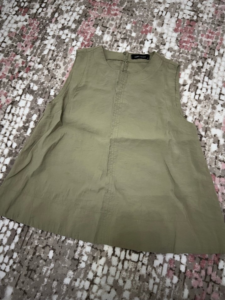 Keten kumaştan, kolsuz ve salaş kesim bohem tarzda, düğmeli ön detaylı, midi uzunlukta haki renk kadın bluz.
