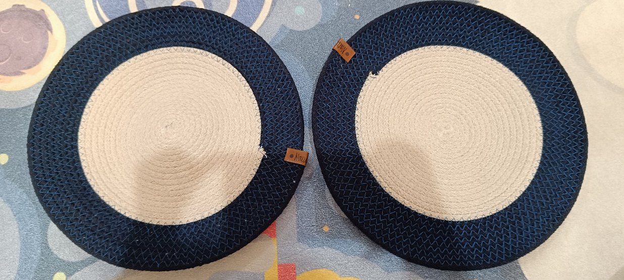 bohem tarzı, koyu mavi hasır kenarlı, doğal renkte orta kısmı ve küçük deri etiketi bulunan Amerikan servis