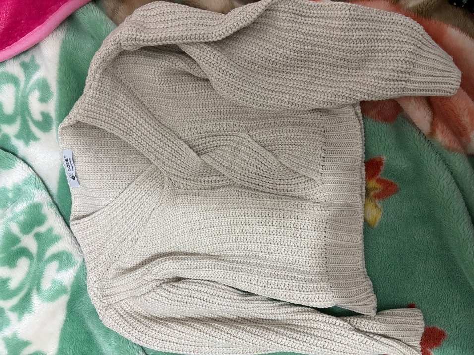Boğazlı, krem renkli, bohem tarzda örme triko kazak. Rahat ve şık, günlük kullanım için uygundur.