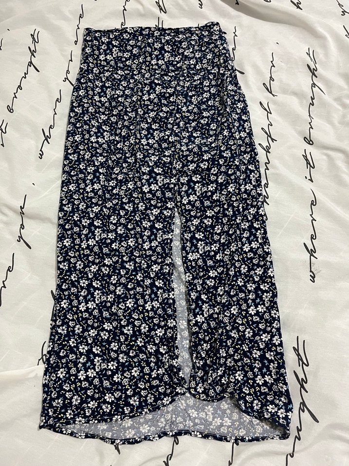 Lacivert midi etek, bol kesim ve drapeli detaylara sahip. Koyu çiçekli tie-dye deseni ve yumuşak sentetik kumaştan üretilmiştir.