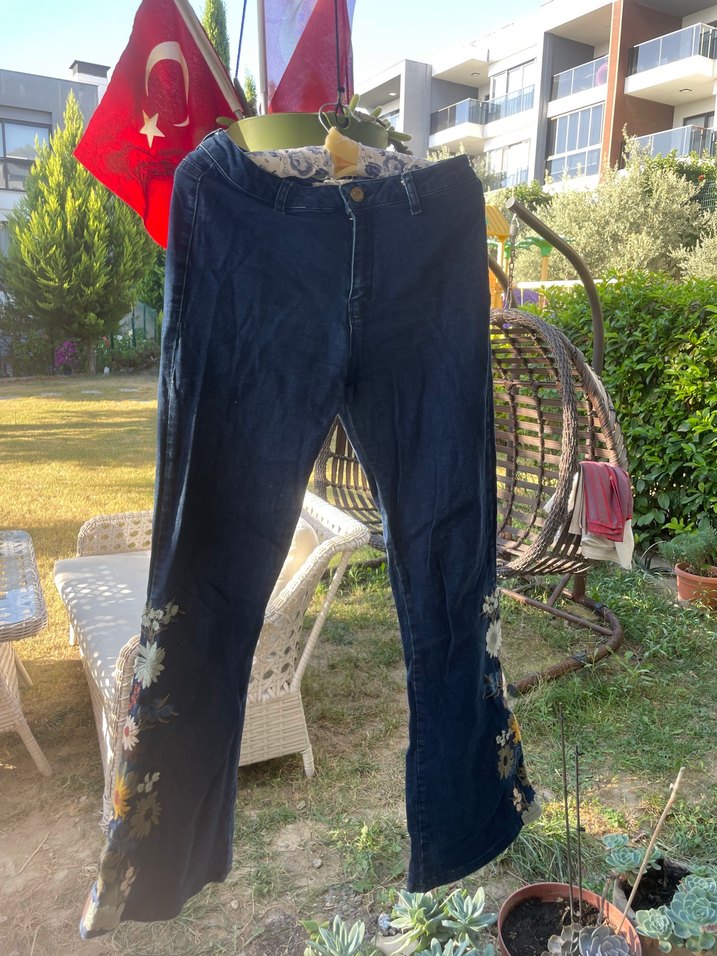 Bohem tarz lacivert kot pantolon, midi boy ve bol kesim. Tokalı detaylar ve çiçek nakışları ile dış mekan kullanımı için uygun.