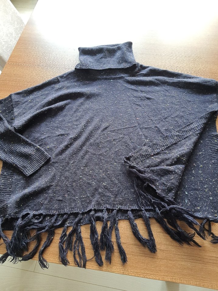 Lacivert yün kumaştan, boğazlı, uzun kollu, gevşek kesim ve püsküllü etek ucu detaylı, bohem tarzda kadın panço.