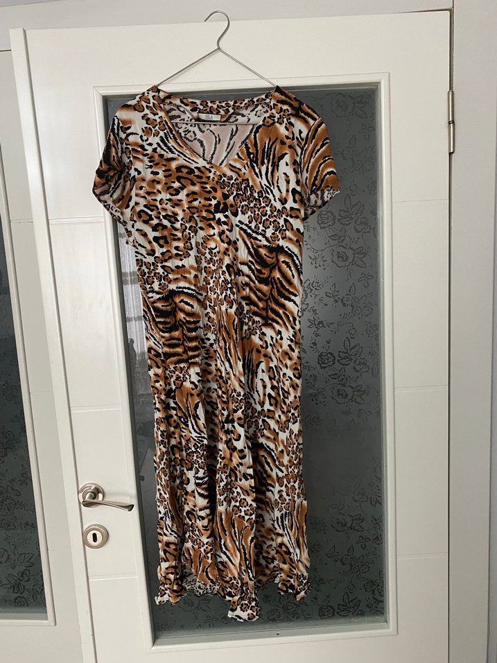 V yaka, kısa kollu, bol kesim, drapeli uzun elbise. Yumuşak sentetik kumaştan, koyu kahverengi zebra desenli, bohem tarz için uygun.
