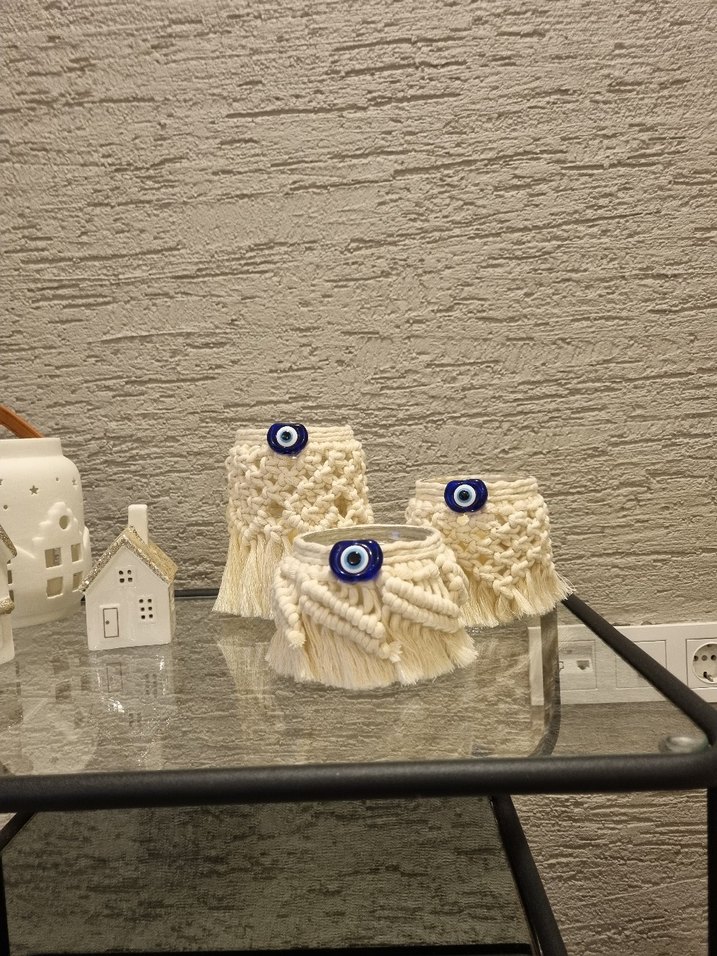 Yumuşak, doğal ipliklerle yapılmış, mavi nazar boncuklu bohem tarz makrome süsler. Mekanınıza özgünlük katmak için ideal.