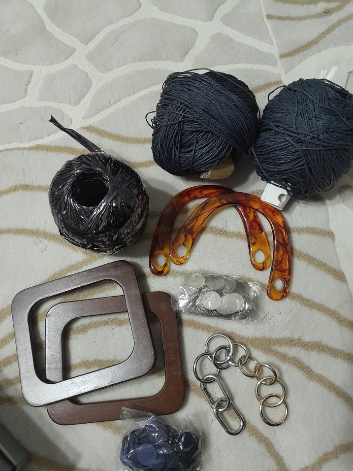 Bu makrome seti, siyah iplik, kehribar renkli saplar, ahşap kare çerçeveler, metal halkalar ve diğer aksesuarları içerir.