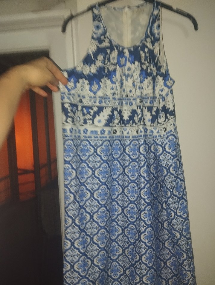 Mavi desenli, straplez yaka ve kolsuz, elbisesi, günlük kullanım için uygun drapeli detaylara sahiptir.