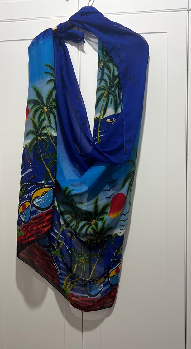 İpek görünümlü, bohem tarzda, koyu mavi zemin üzerine canlı palmiyeler ve gün batımı desenleri içeren pareo. En: 175 boy: 104cm
