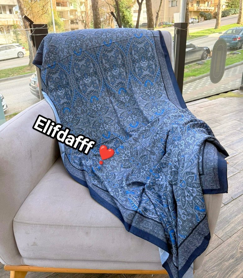 Mavi ve gri tonlarda, dökümlü bohem tarzda, rahat ve mütevazı kadın şalı. Yumuşak sentetik kumaştan yapılmıştır. OCR: "Elifdafff".