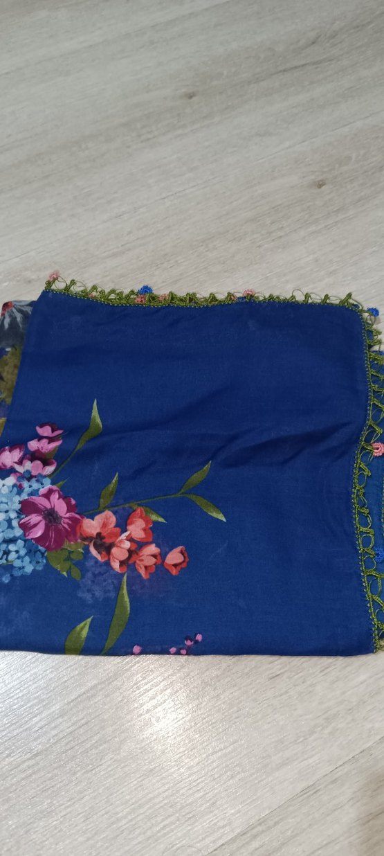 Koyu mavi renkli, çiçek desenli ve yeşil ince işlemeli kenar detayına sahip bohem tarzda kadın şalı.