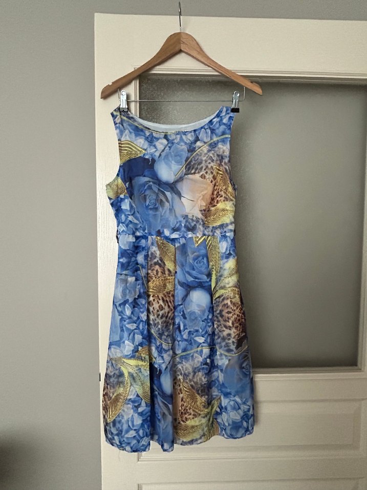 Askısız yaka, dökümlü tasarım ve salaş kesimle midi boy, bohem tarzda mavi elbise. hafif batik desenli.