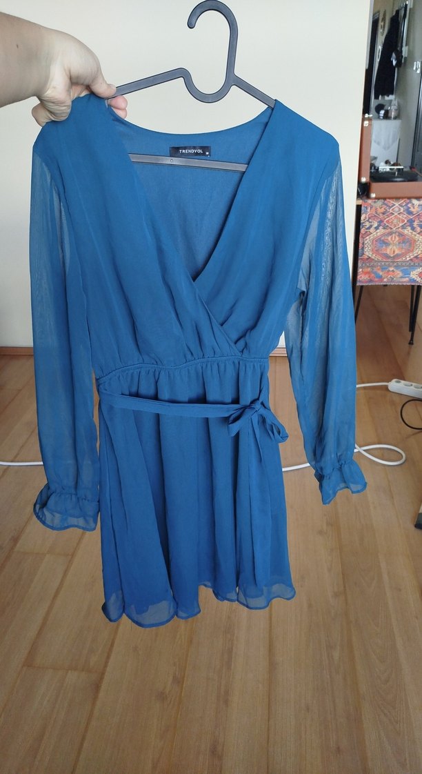 Bol kesim, uzun kollu mavi midi elbise, belden bağlamalı ve sargılı tasarıma sahip. Hafif, desen içermeyen kumaşlı bohem tarzı.