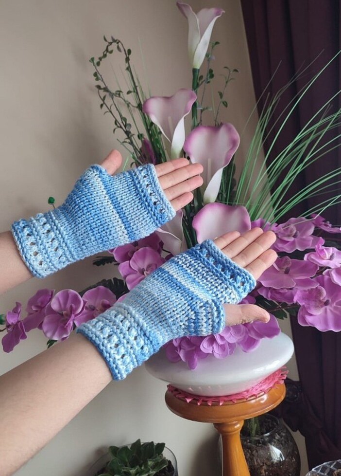 Bohem tarzda, pastel mavi renkli örgü kadın eldivenleri. Parmaksız yapısıyla hareket özgürlüğü sağlar, sıcak tutar.