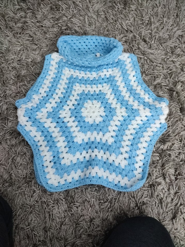 Renkli örgü kız panço, bol kesim ve boğazlı yaka ile mavi-beyaz retro batik desenine sahip.