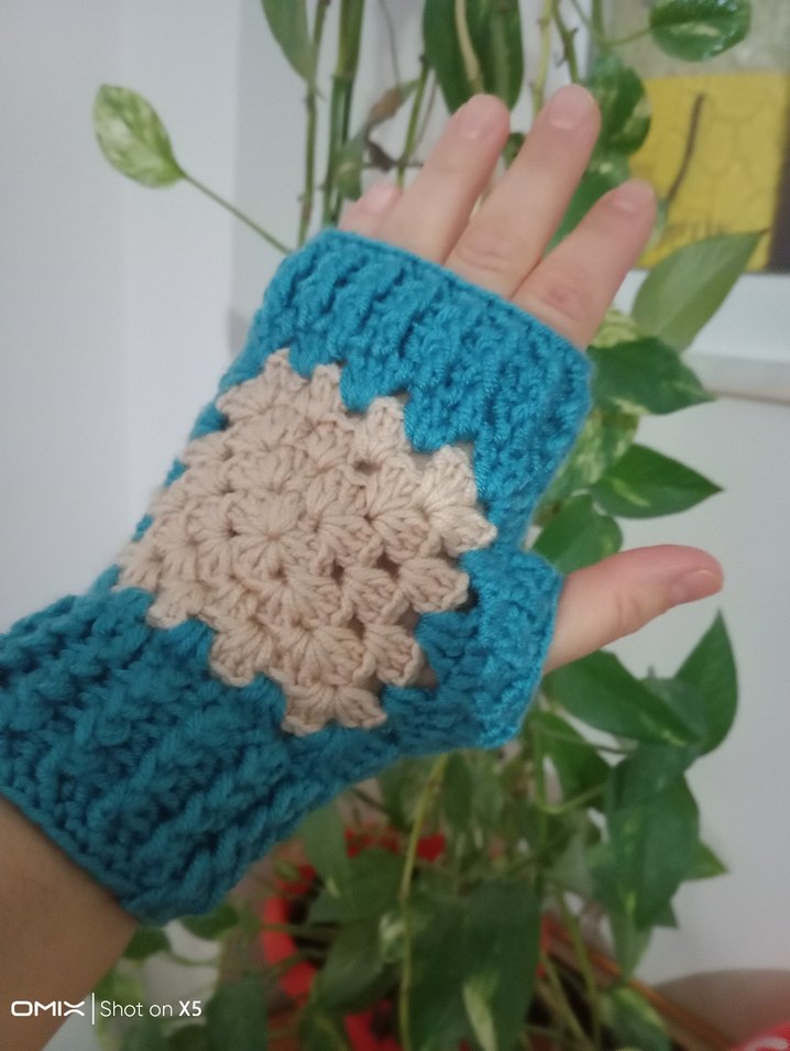 Mavi örgü parmaksız eldivenler, pastel bej çiçek desenine sahip, bohem tarzda rahat ve sıcak tutan yumuşak dokuda.