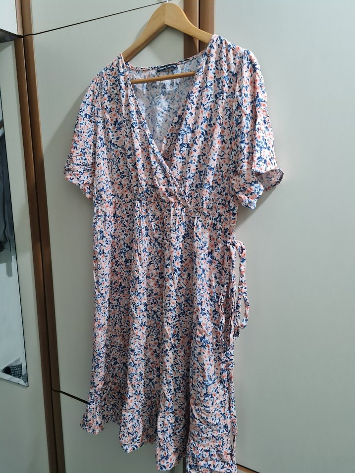 Pastel tonlarda bağlama detaylı, kısa kollu, V yakalı, bol kesim midi elbise. Bohem tarzı yansıtıyor.