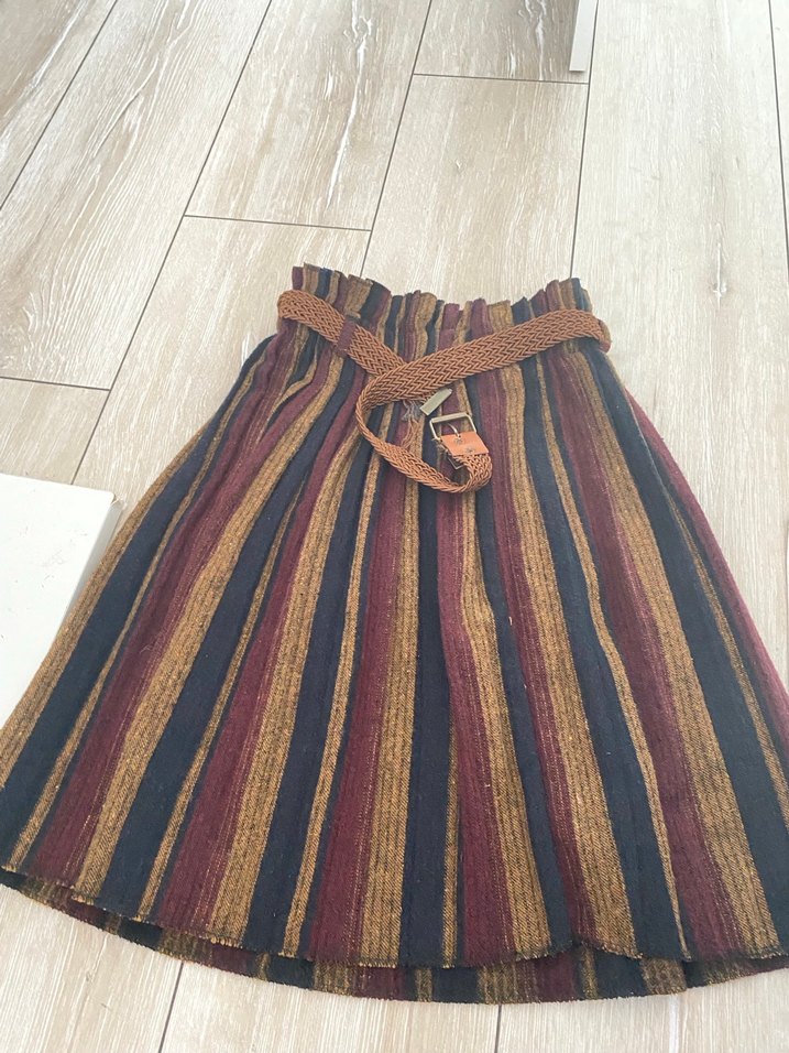 Bu kahverengi hamile eteği, piliseli ve batik çizgili desenli, bol kesimdir. Bohem tarzda olup, dokuma kemer ile birlikte gelir. Günlük kullanıma uygundur.