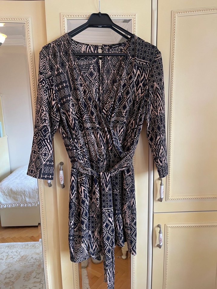 Bohem tarzda, belden kuşaklı, koyu kahverengi geometrik desenli, uzun kollu ve bol kesim midi elbise. Rahat ve şık görünümlü.