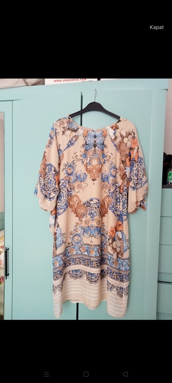Bej renkli, sentetik kumaştan, kısa kollu, salaş kesim midi elbise. Drapeli detaylı ve pastel tonlarda batik desenlidir. Günlük kullanıma uygundur.