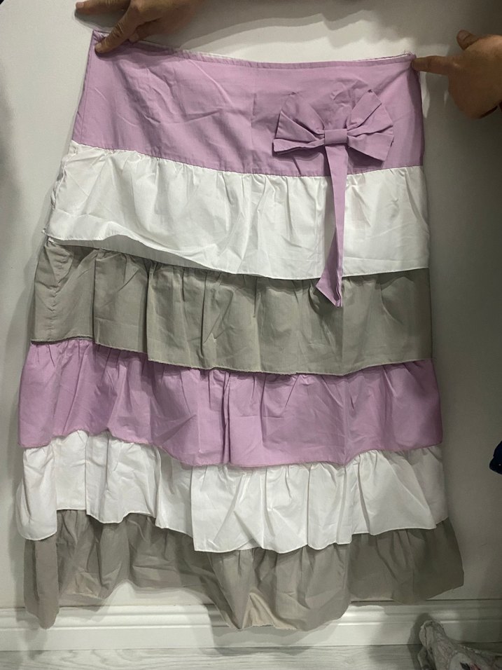 Bohem tarzda, fırfırlı ve fiyonk detaylı, pastel mor tonlarında bol kesim hamile eteği. Günlük kullanıma uygundur.