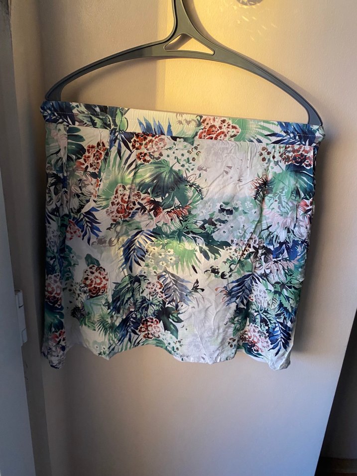 Midi boyda, salaş kesimli ve drapeli, çok renkli tie-dye desenli, yumuşak sentetik kumaştan yapılmış bohem tarzda etek.