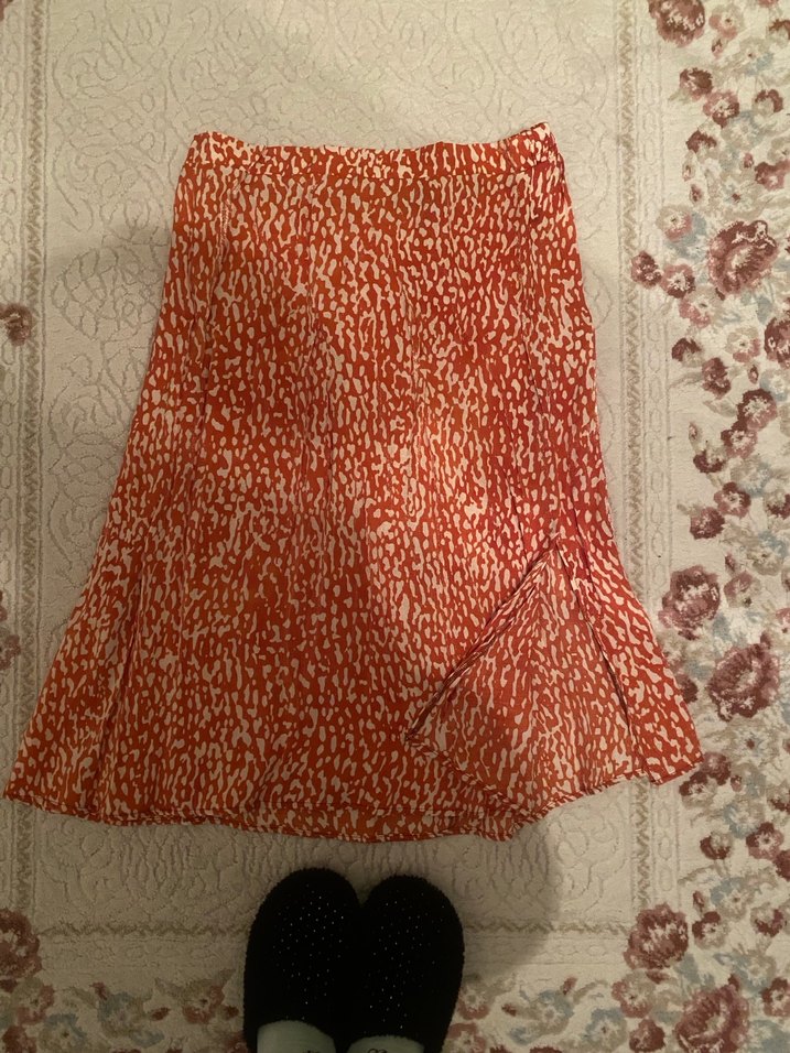 Hafif kırmızı tonlarda batik desenli, bol kesim ve yırtmaç eteği, yumuşak sentetik kumaştan. Rahat ve bohem tarz için uygun.
