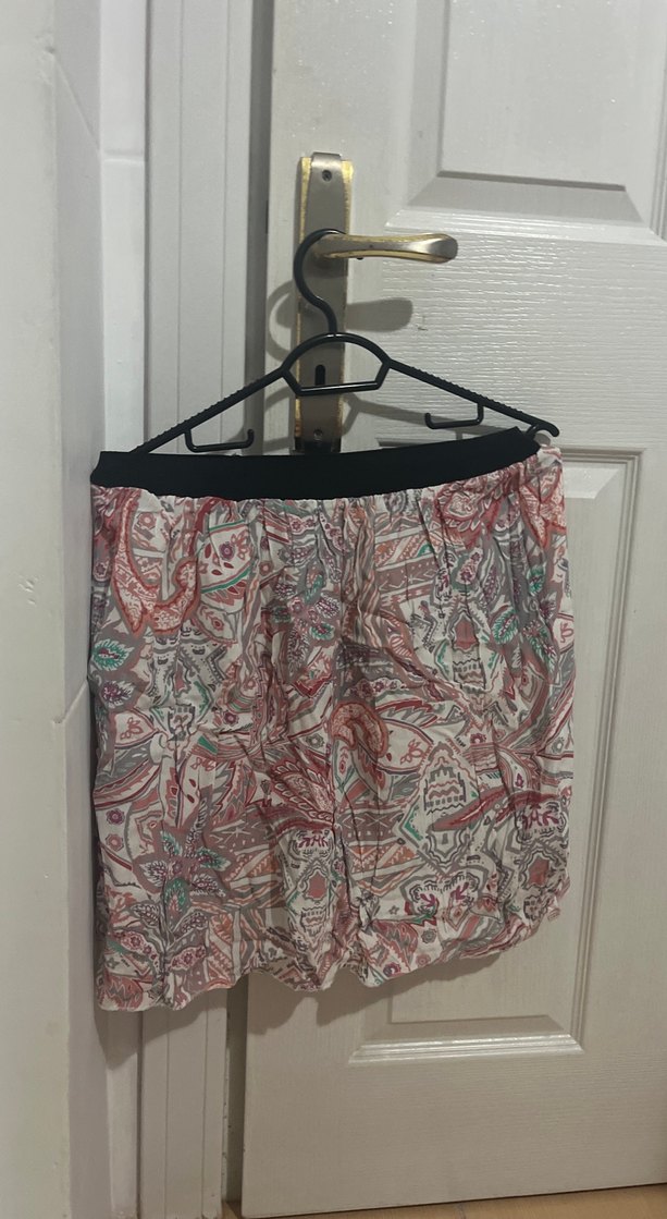 Bohem tarzda, çok renkli bağlama desenli, yumuşak kumaştan, rahat kesim mini hamile eteği.