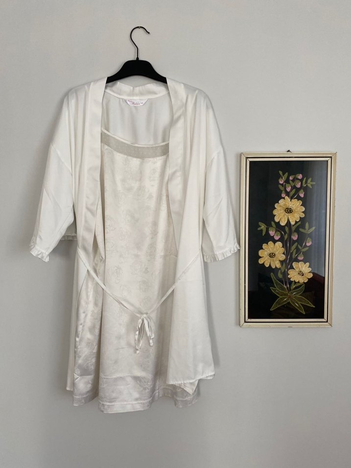Bohem tarzda, hafif ve yumuşak kumaştan yapılmış, askılı kollu, bol kesim mini beyaz kadın sabahlık. Rahat kullanım için uygundur.