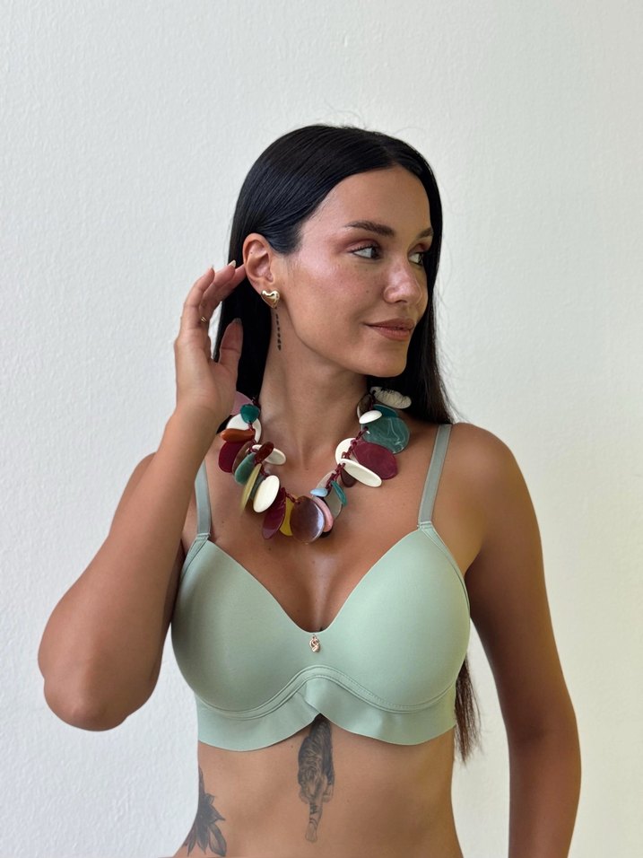 Bohem tarzda, pastel haki renginde, kısa mini uzunlukta ve desensiz tasarıma sahip sütyen. Ayarlanabilir askılarıyla rahat kullanım sağlar.