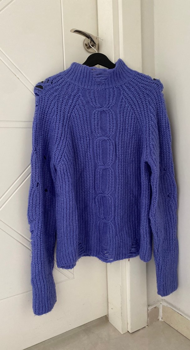 Mor renkli, balıkçı yaka ve uzun kollu, bol kesim triko kazak. Bohem tarzı ve normal uzunluğu ile günlük kullanıma uygundur. Rahat ve sıcak bir yapıya sahiptir.