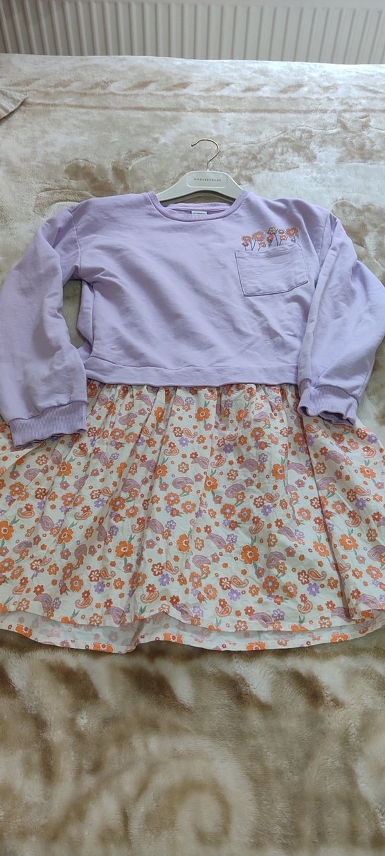 Uzun kollu, yuvarlak yakalı, bol kesim kız elbisesi. Pastel mor üst kısmında nakışlı çiçekler ve küçük cep bulunur. Etek kısmı çiçek desenli ve dantel detaylıdır. Bohem tarzı yansıtır.