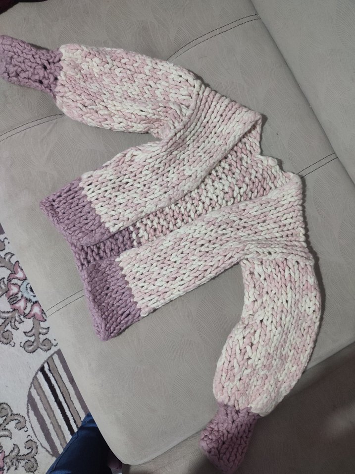 Pastel mor renkte, tek renk örgü triko hırka, kayık yaka ve bol kesim ile bohem tarzda, rahat kullanım sağlar. 3,4 yaş 5 yaşa kadar kullanır kalın ip yundur