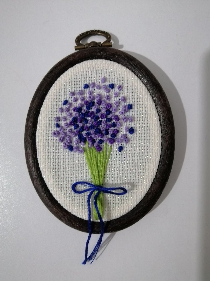 %100 El Emeği Bohem tarzda, mor çiçeklerden oluşan bir buketin mavi iplikle bağlı olduğu nakışlı duvar süsü, koyu renk oval çerçevede.