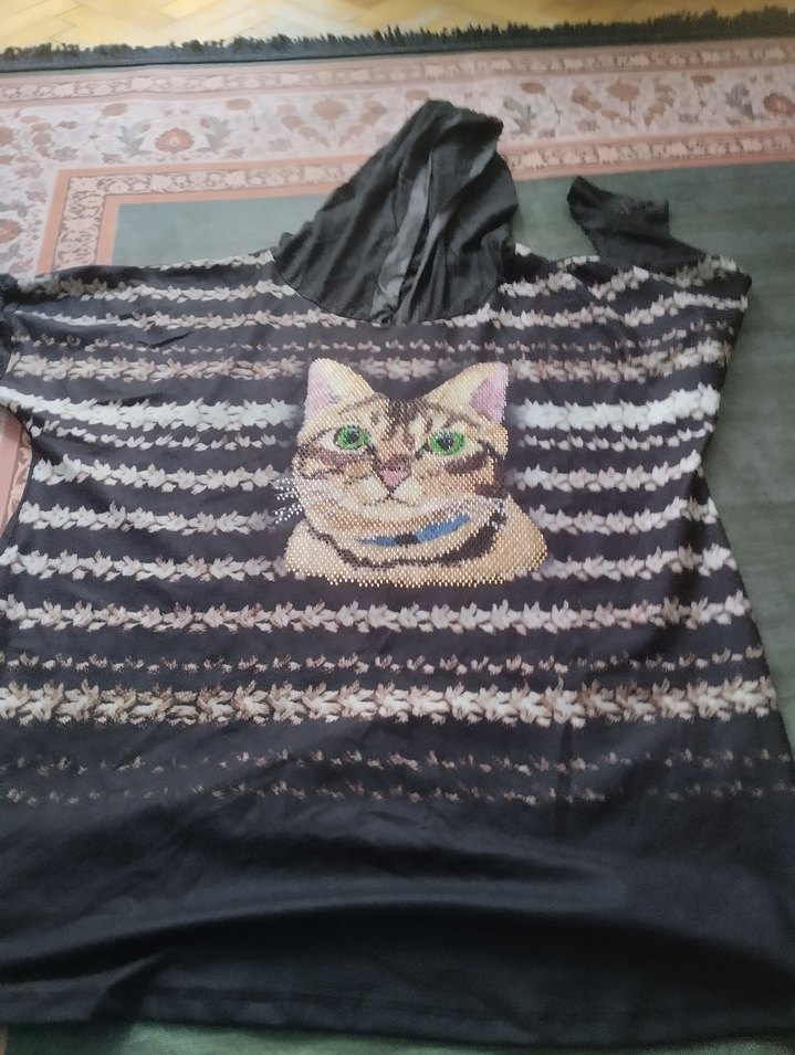Koyu gri örgü kapüşonlu, bohem tarzda nakışlı kedi yüzü deseni ile. Çizgili ve çiçekli desenler birleşiyor.
