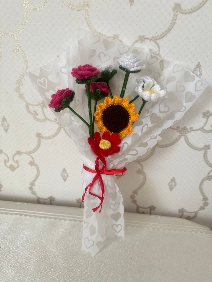 Bohem tarzda, ayçiçeği, güller ve papatyalar gibi el örgüsü çiçeklerden oluşan, kalp desenli kağıda sarılı ve kırmızı kurdela ile bağlanmış buket.