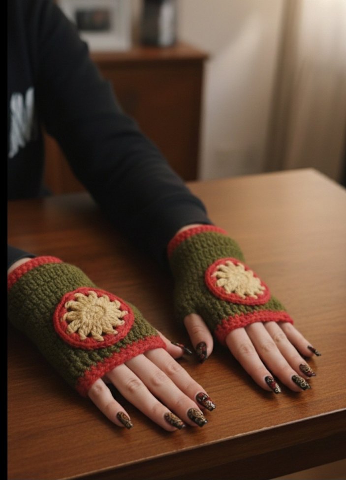 GÖRSEL BANA AİTTİR ✔️ İLAN AÇIYORUM ÖZEL TASARIM Koyu haki renkte örgü, bohem tarzı kadın eldiveni, rahat ve retro desenlerle süslenmiş.