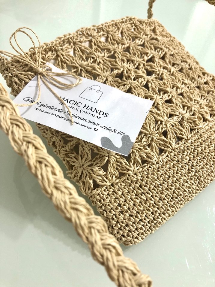 Dokuma deseni ve örgü saplarıyla bohem tarzda, doğal görünümlü el yapımı hasır çanta.