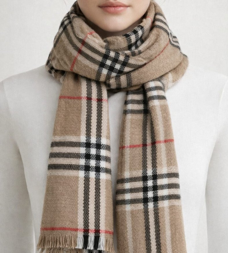Bohem tarzda kadın atkısı, kahverengi ve gri tonlarda, yumuşak dokulu akrilik kumaştan üretilmiştir. Retro kareli deseni ve ince püskülleri vardır.