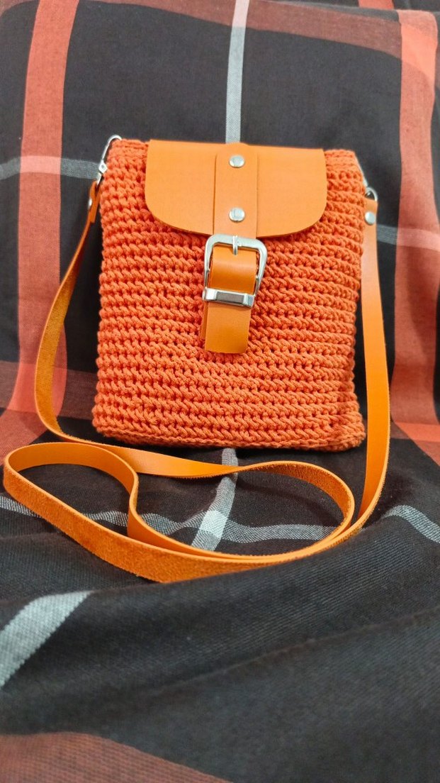 Örgü kumaştan, tokalı deri kapaklı ve ayarlanabilir askılı kadın çapraz çanta. Sıcak kahverengi, rahat ve bohem tarzıyla günlük kullanıma uygun.