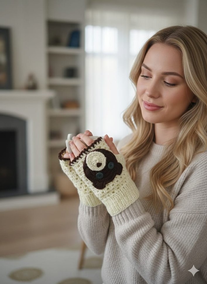 Bohem tarzda, örgü kadın eldiveni, sevimli ayı detaylı, rahat ve retro görünümlü.