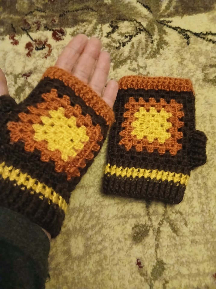 Sıcak ve bohem tarzda, koyu kahverengi üzerine sarı ve turuncu detaylı örgü kadın eldiveni. Parmaksız tasarım rahatlık sağlar.