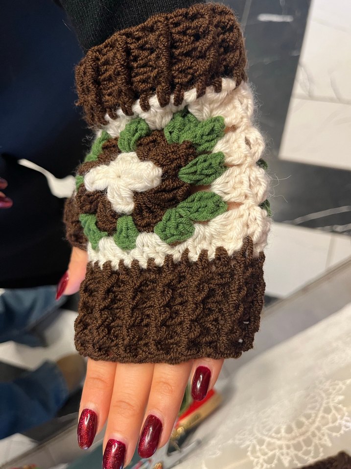 Koyu kahverengi örgü eldivenler, yeşil ve krem renkli retro çiçek desenli, bohem ve hippie tarzını yansıtan rahat bir tasarıma sahiptir.